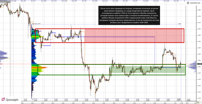 Евро после теста зоны продавца во вторник, котировка отскочила, встретив агрессивного продавца, и в среду продолжила падение. Цена остановилась в районе 1350 на тесте крупного объема покупателя, который показал свое присутствие и покупки возобновились. В случае пробоя объема покупателя 1350 и закрепления ниже этой области, трендовые продажи должны продолжиться. Если же покупатель все еще активен, рост продолжится в район 1500-1600.