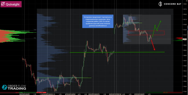 Котировка продолжает торговаться в коррекционном снижении. Цель снижения район 1202. В случае пробития красной зоны покупки должны возобновиться