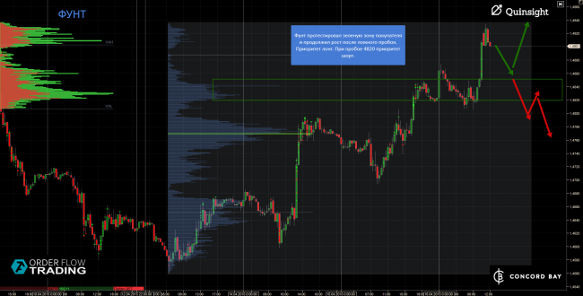 Евро продолжает торговаться в восходящей тенденции в канале. На европейской сессии покупатель отработал объем в зеленой зоне. Внутридневная тенденция лонговая, но потенциал почти исчерпан.